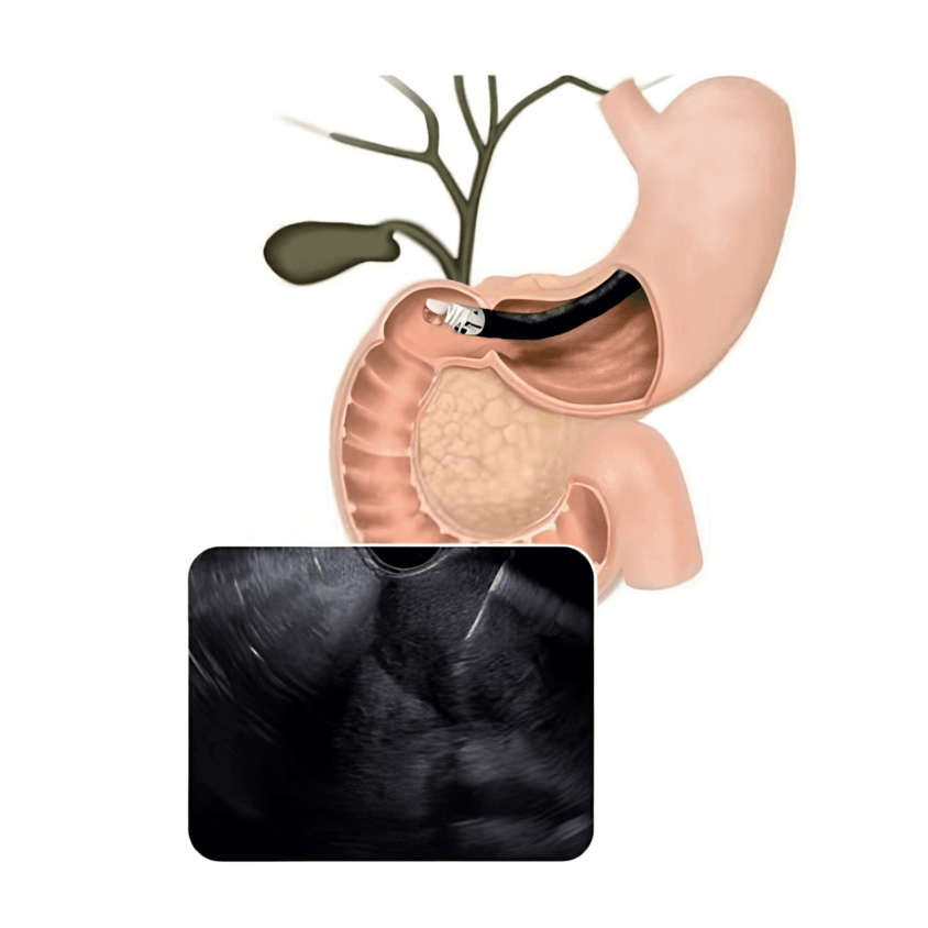 Under sedation, a thin, flexible endoscope with an ultrasound device and a fine needle is gently inserted through the mouth into the digestive tract. Real-time ultrasound images guide the needle to the target area to collect tissue samples.